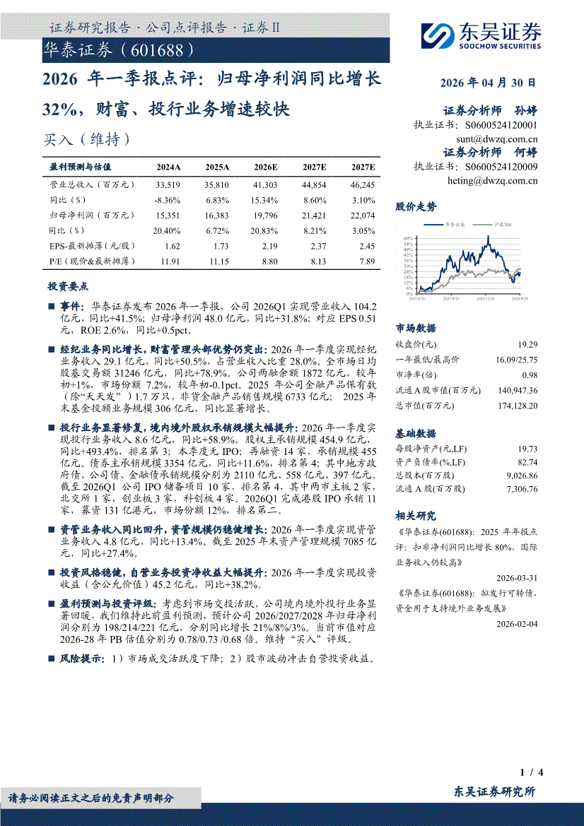 华泰证券:东吴证券-华泰证券-601688-2026年一季报点评:归母净利润同比增长32%,财富、投行业务增速较快-260430