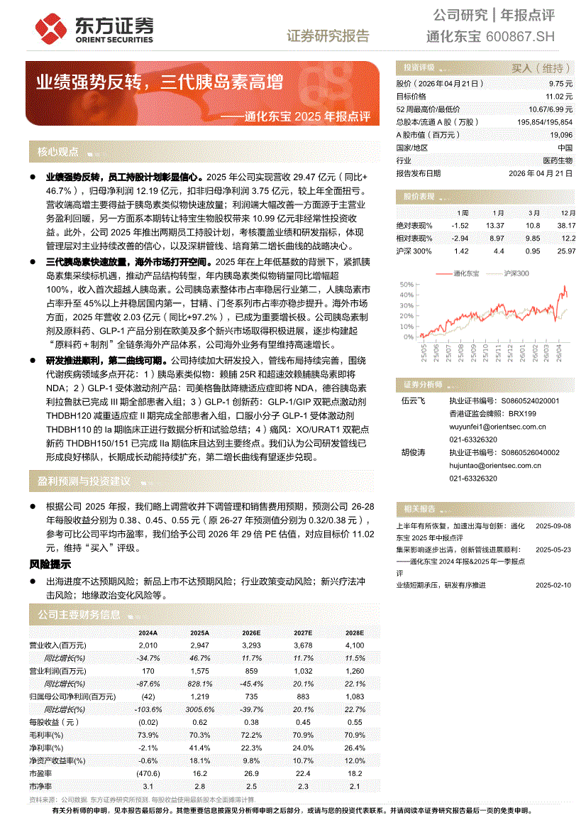 通化东宝:东方证券-通化东宝-600867-2025年报点评:业绩强势反转,三代胰岛素高增-260421