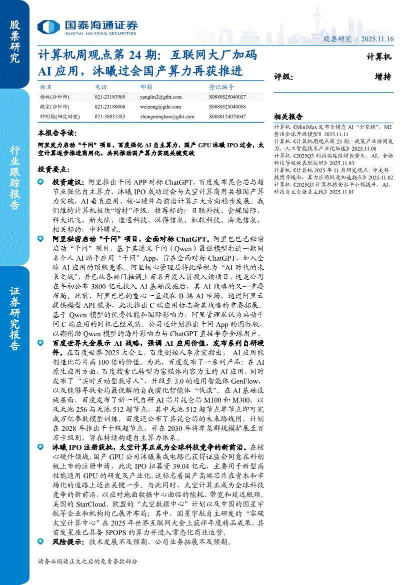 计算机行业:国泰海通证券-计算机行业周观点第24期:互联网大厂加码AI应用,沐曦过会国产算力再获推进-251116