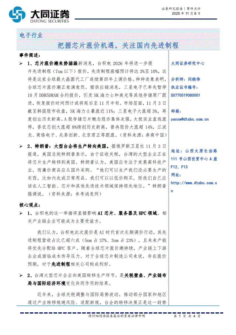 电子行业:大同证券-电子行业:把握芯片涨价机遇,关注国内先进制程-251106