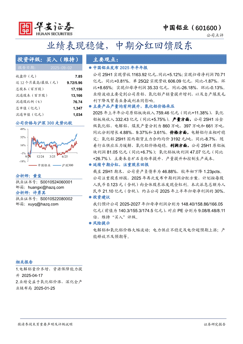 中国铝业:华安证券-中国铝业-601600-业绩表现稳健,中期分红回馈股东-250902