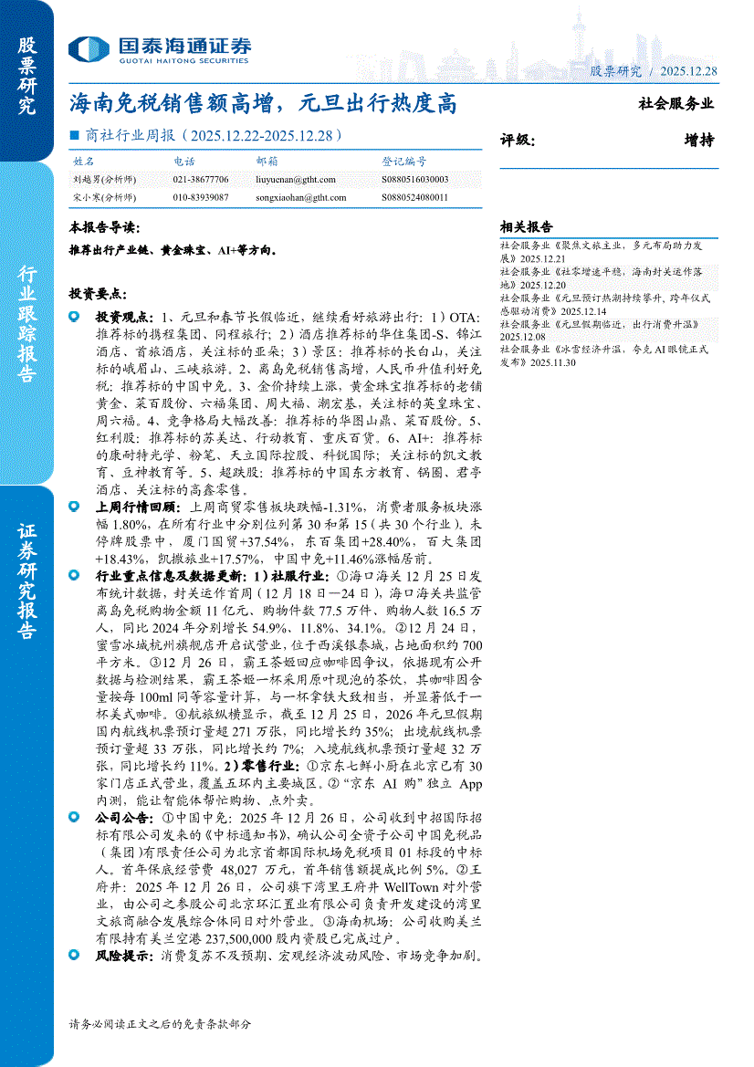 社会服务行业:国泰海通证券-商社行业周报:海南免税销售额高增,元旦出行热度高-251228