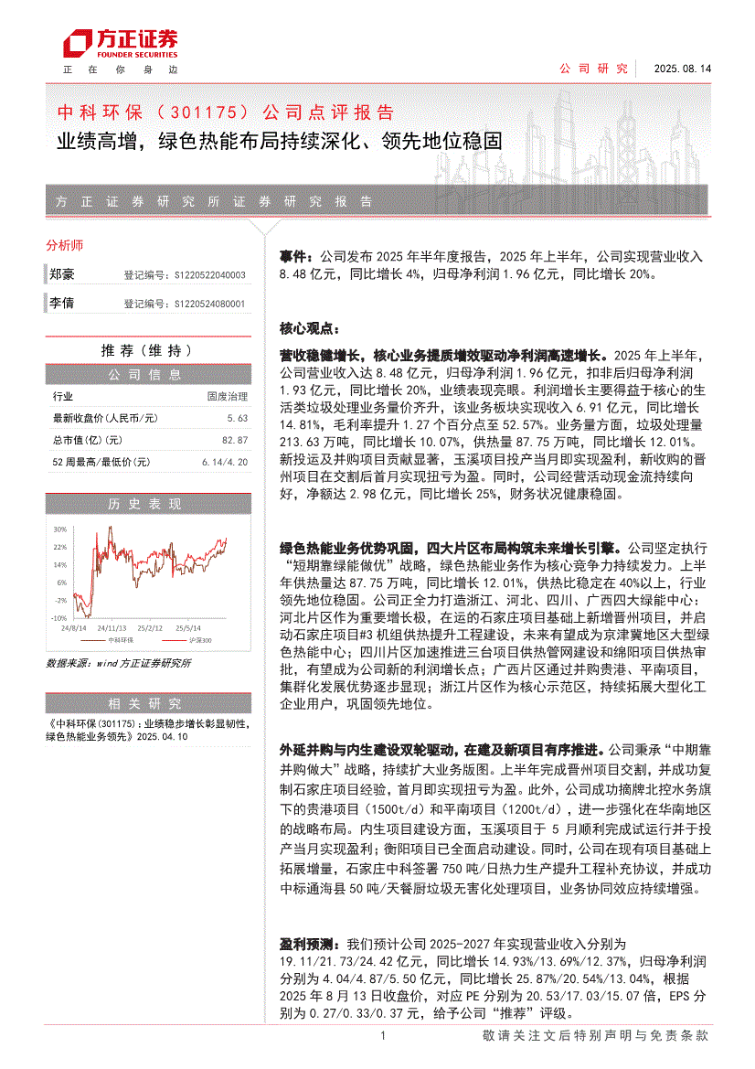 中科环保:方正证券-中科环保-301175-公司点评报告:业绩高增,绿色热能布局持续深化、领先地位稳固-250814
