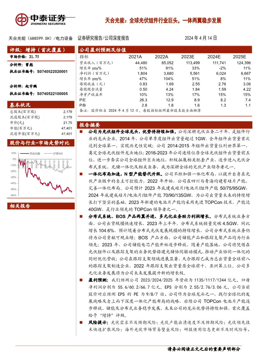 天合光能:中泰证券-天合光能-688599-全球光伏组件行业巨头,一体两翼稳步发展-240414