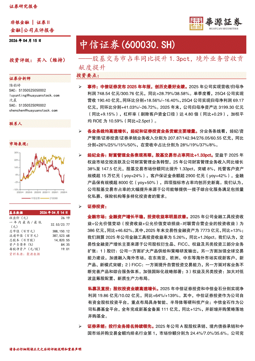 中信证券:华源证券-中信证券-600030-股基交易市占率同比提升1.3pct,境外业务营收贡献度提升-260415