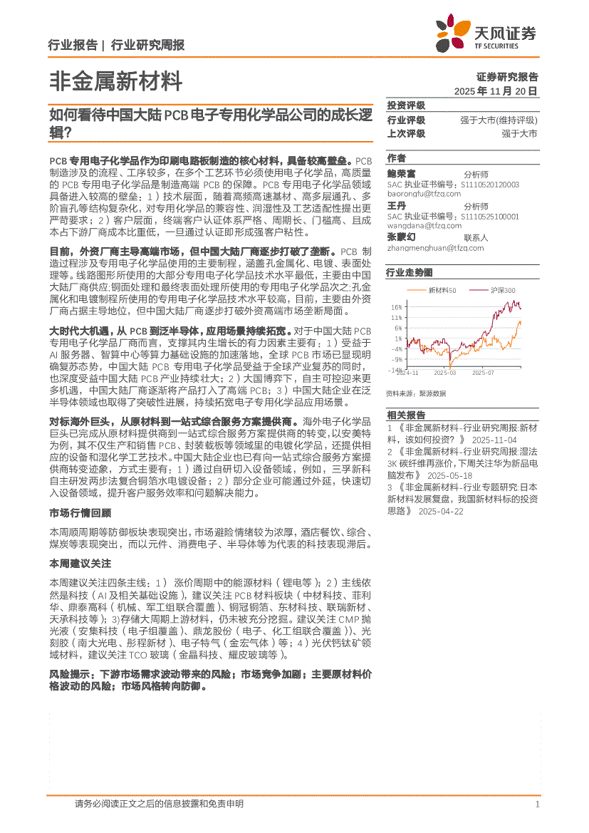 非金属新材料行业:天风证券-非金属新材料行业:如何看待中国大陆PCB电子专用化学品公司的成长逻辑?-251120
