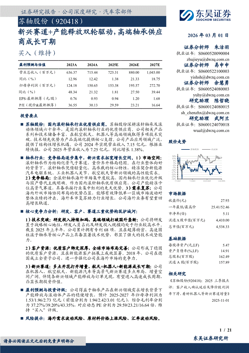 苏轴股份:东吴证券-苏轴股份-920418-新兴赛道+产能释放双轮驱动,高端轴承供应商成长可期-260301