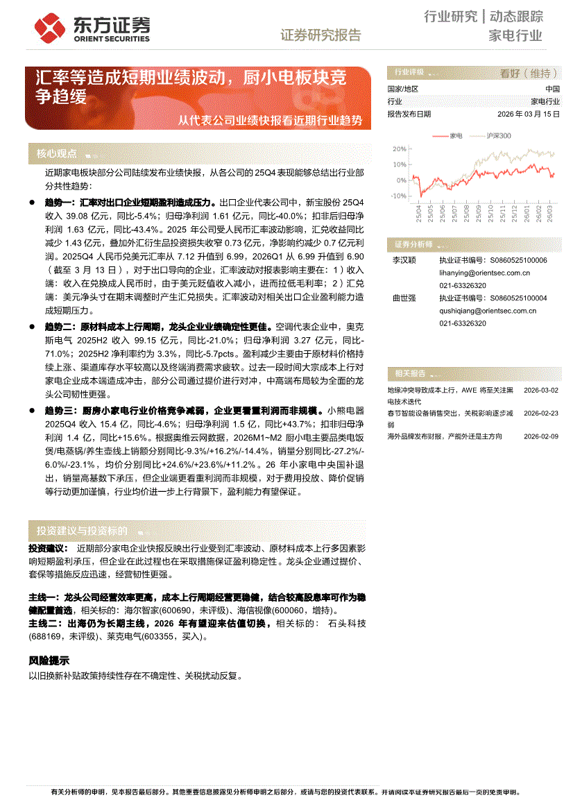 家电行业:东方证券-家电行业从代表公司业绩快报看近期行业趋势:汇率等造成短期业绩波动,厨小电板块竞争趋缓-260315