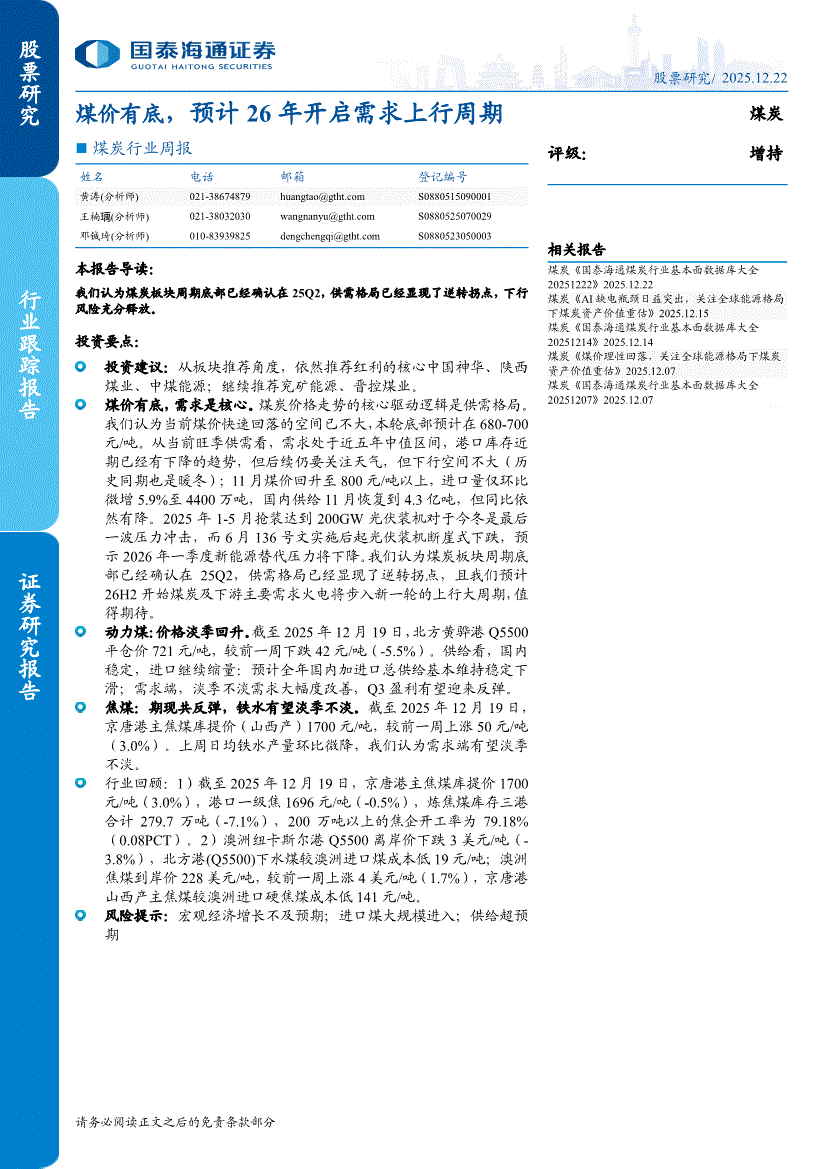 煤炭行业:国泰海通证券-煤炭行业周报:煤价有底,预计26年开启需求上行周期-251222