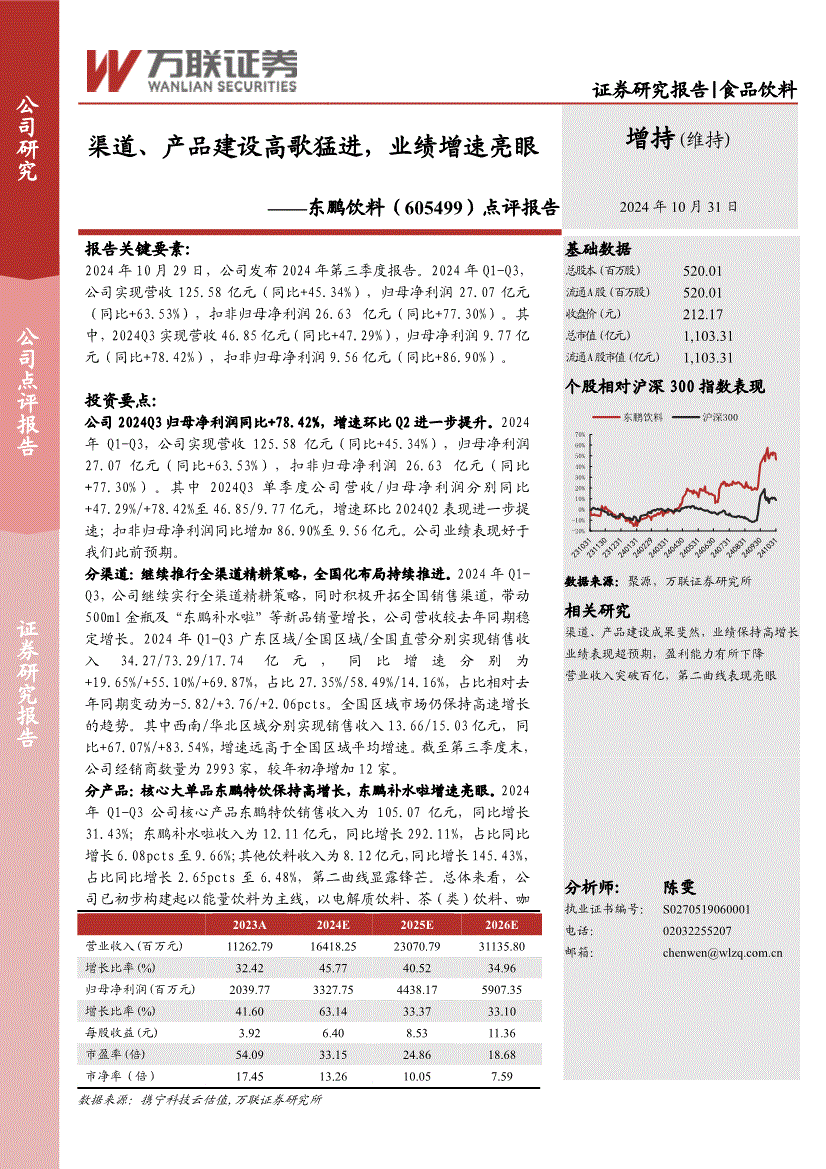 东鹏饮料:万联证券-东鹏饮料-605499-点评报告:渠道、产品建设高歌猛进,业绩增速亮眼-241031