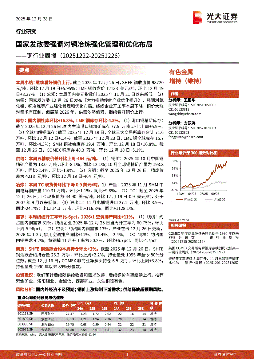 有色金属行业:光大证券-铜行业周报:国家发改委强调对铜冶炼强化管理和优化布局-251228