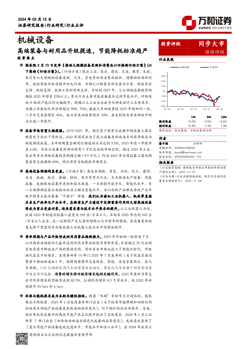 机械设备行业:万和证券-机械设备行业点评:高端装备与耐用品升级提速,节能降耗标准趋严-240315