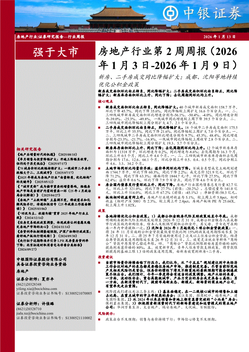 房地产行业:中银国际-房地产行业第2周周报(2026年1月3日~2026年1月9日):新房、二手房成交同比降幅扩大;成都、沈阳等地持续优化公积金政策-260113
