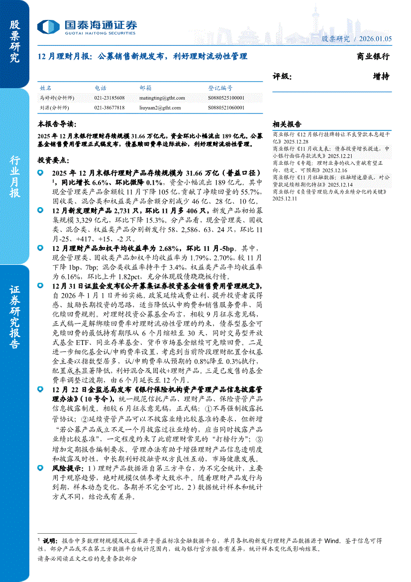 商业银行业:国泰海通证券-商业银行业12月理财月报:公募销售新规发布,利好理财流动性管理-260105