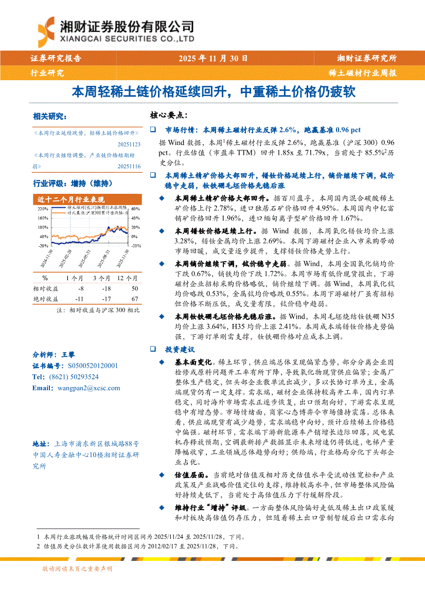 稀土磁材行业:湘财证券-稀土磁材行业周报:本周轻稀土链价格延续回升,中重稀土价格仍疲软-251130