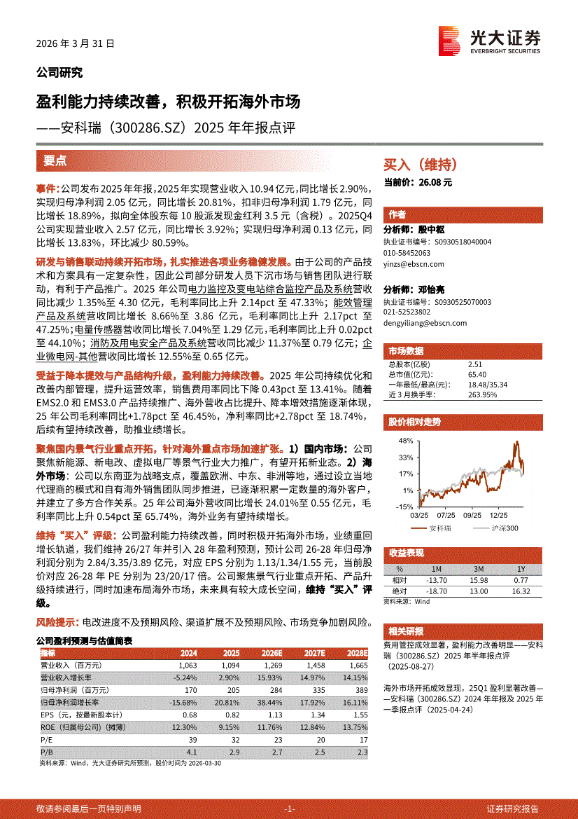 安科瑞:光大证券-安科瑞-300286-2025年年报点评:盈利能力持续改善,积极开拓海外市场-260331