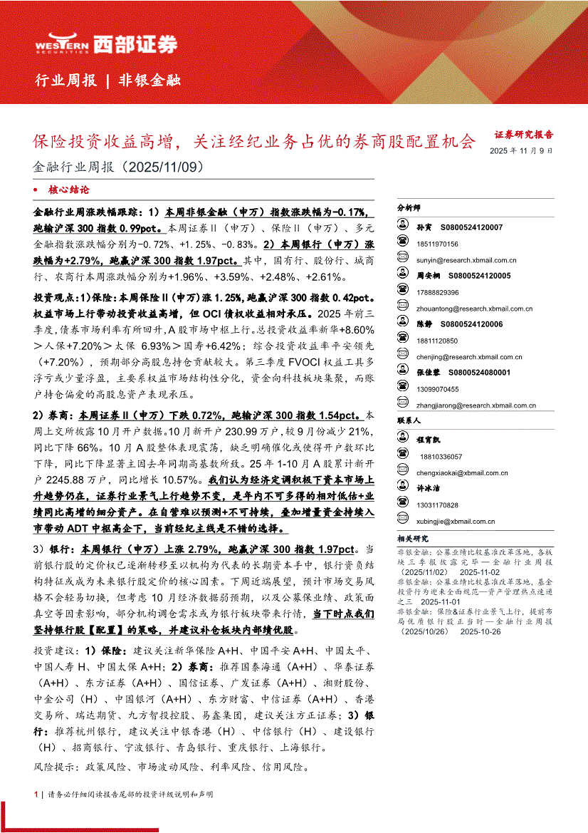 金融行业:西部证券-金融行业周报:保险投资收益高增,关注经纪业务占优的券商股配置机会-251109