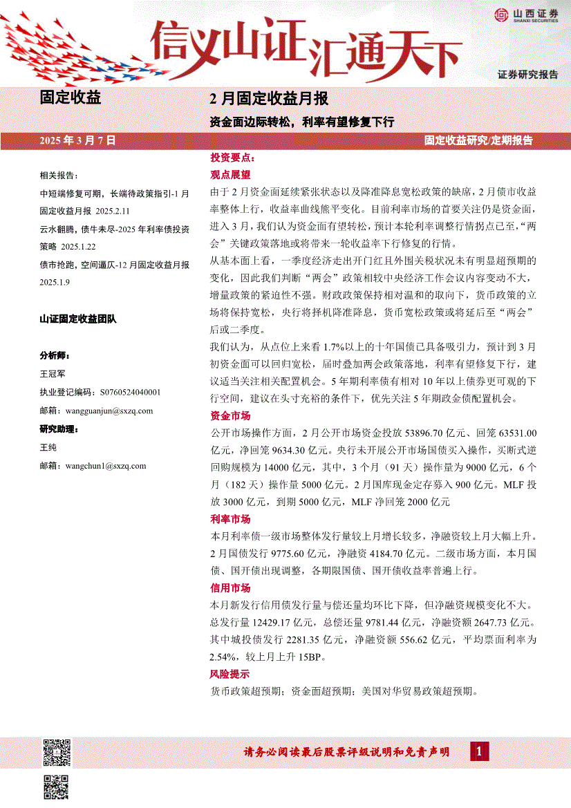 山西证券-2月固定收益月报:资金面边际转松,利率有望修复下行-250307