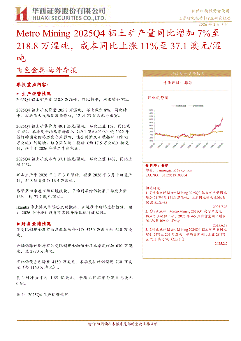 有色金属行业:华西证券-有色金属行业~海外季报:Metro Mining 2025Q4铝土矿产量同比增加7%至218.8万湿吨,成本同比上涨11%至37.1澳元/湿吨-260307