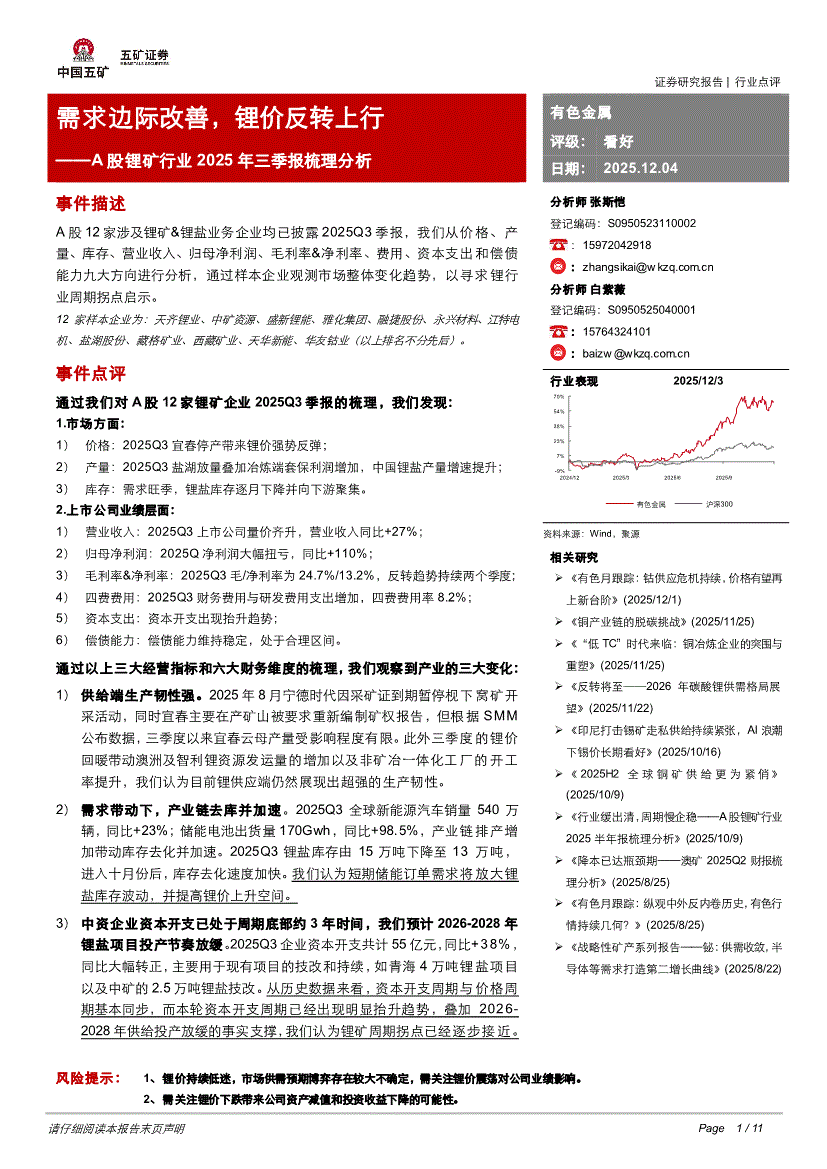 有色金属行业:五矿证券-A股锂矿行业2025年三季报梳理分析:需求边际改善,锂价反转上行-251204