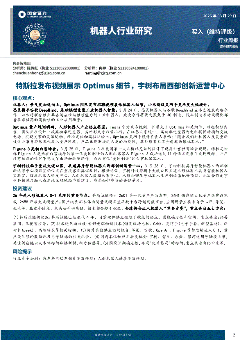 机器人行业:国金证券-机器人行业周报:特斯拉发布视频展示Optimus细节,宇树布局西部创新运营中心-260329