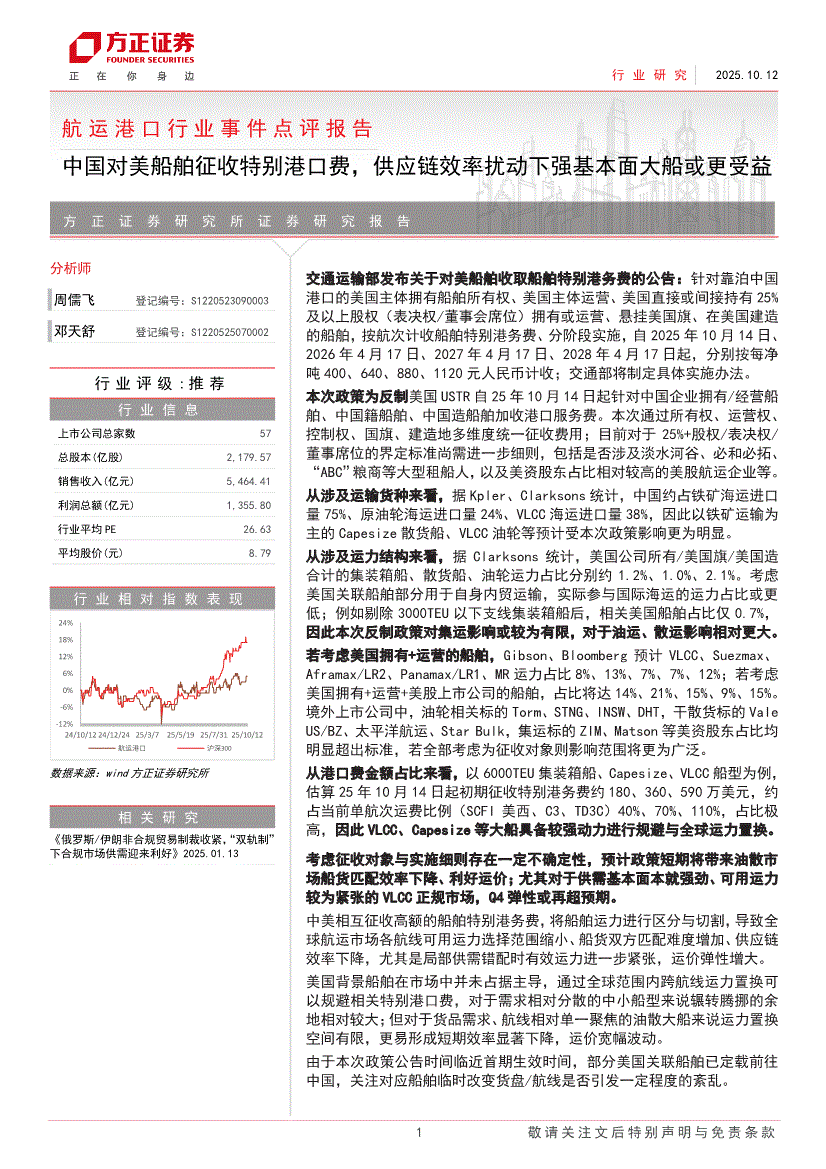 航运港口行业:方正证券-航运港口行业事件点评报告:中国对美船舶征收特别港口费,供应链效率扰动下强基本面大船或更受益-251012