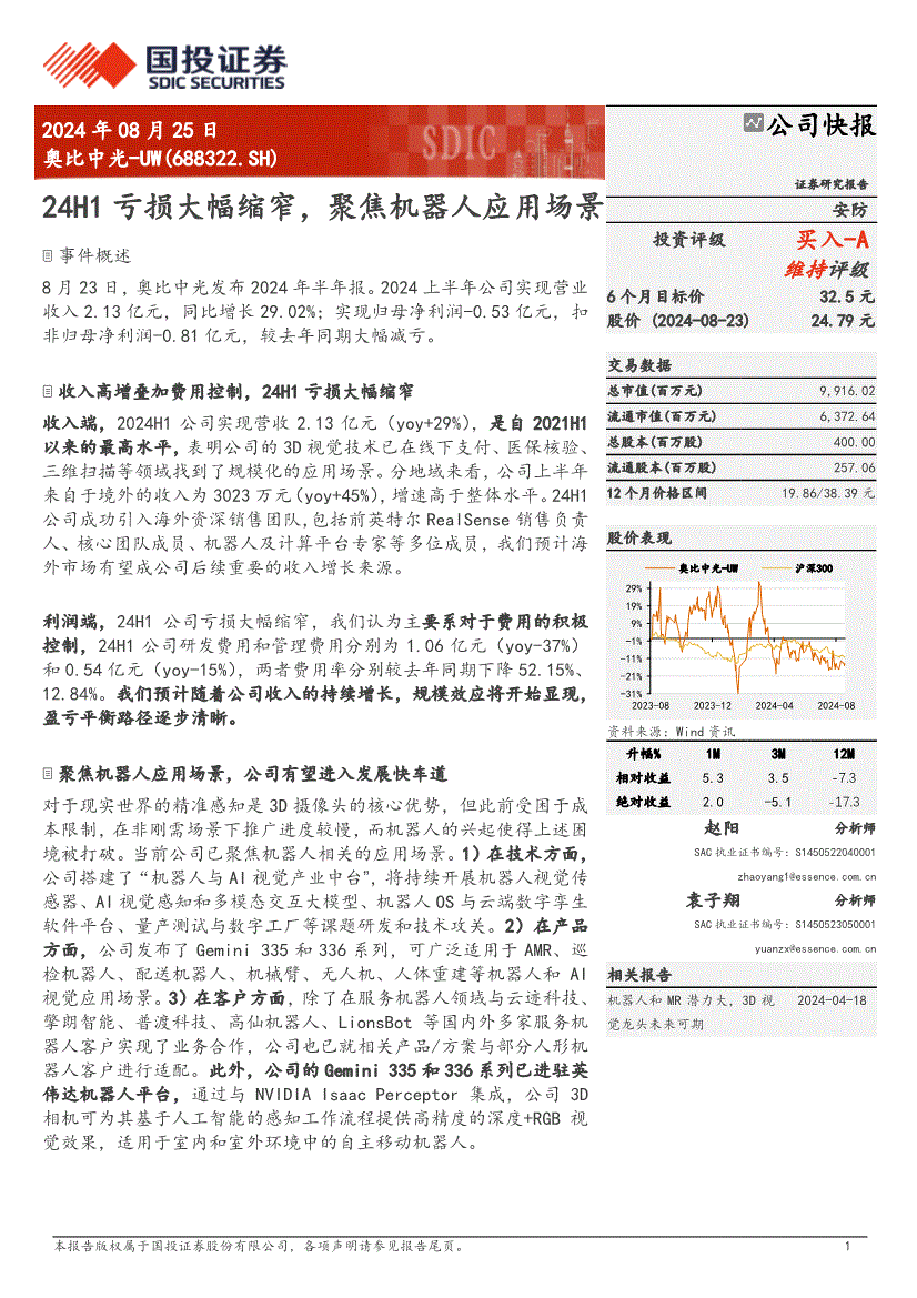 奥比中光:国投证券-奥比中光-688322-24H1亏损大幅缩窄,聚焦机器人应用场景-240825