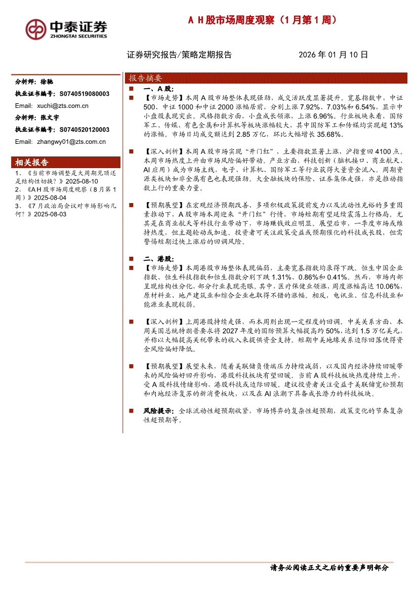 中泰证券-A H股市场周度观察(1月第1周)-260110