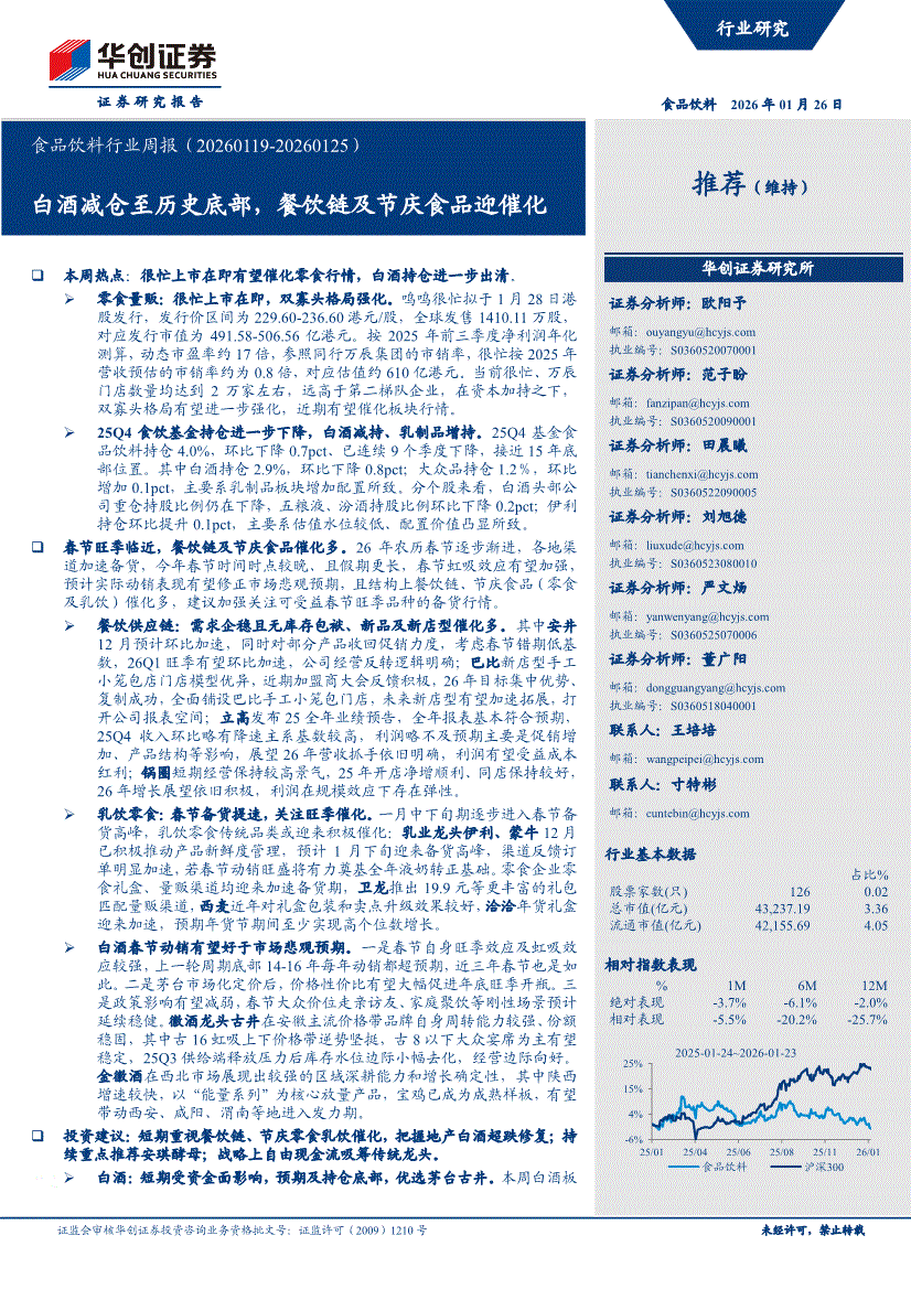 食品饮料行业:华创证券-食品饮料行业周报:白酒减仓至历史底部,餐饮链及节庆食品迎催化-260126