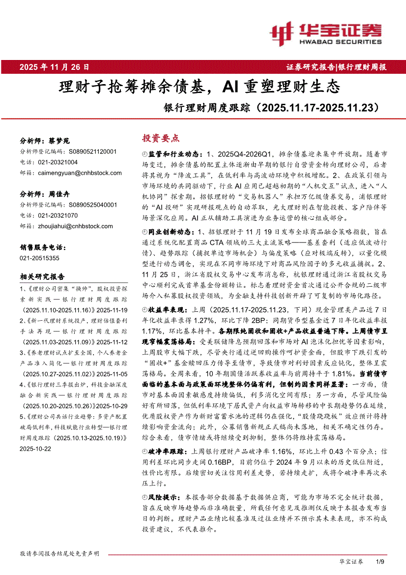 银行业:华宝证券-银行业理财周度跟踪:理财子抢筹摊余债基,AI重塑理财生态-251126