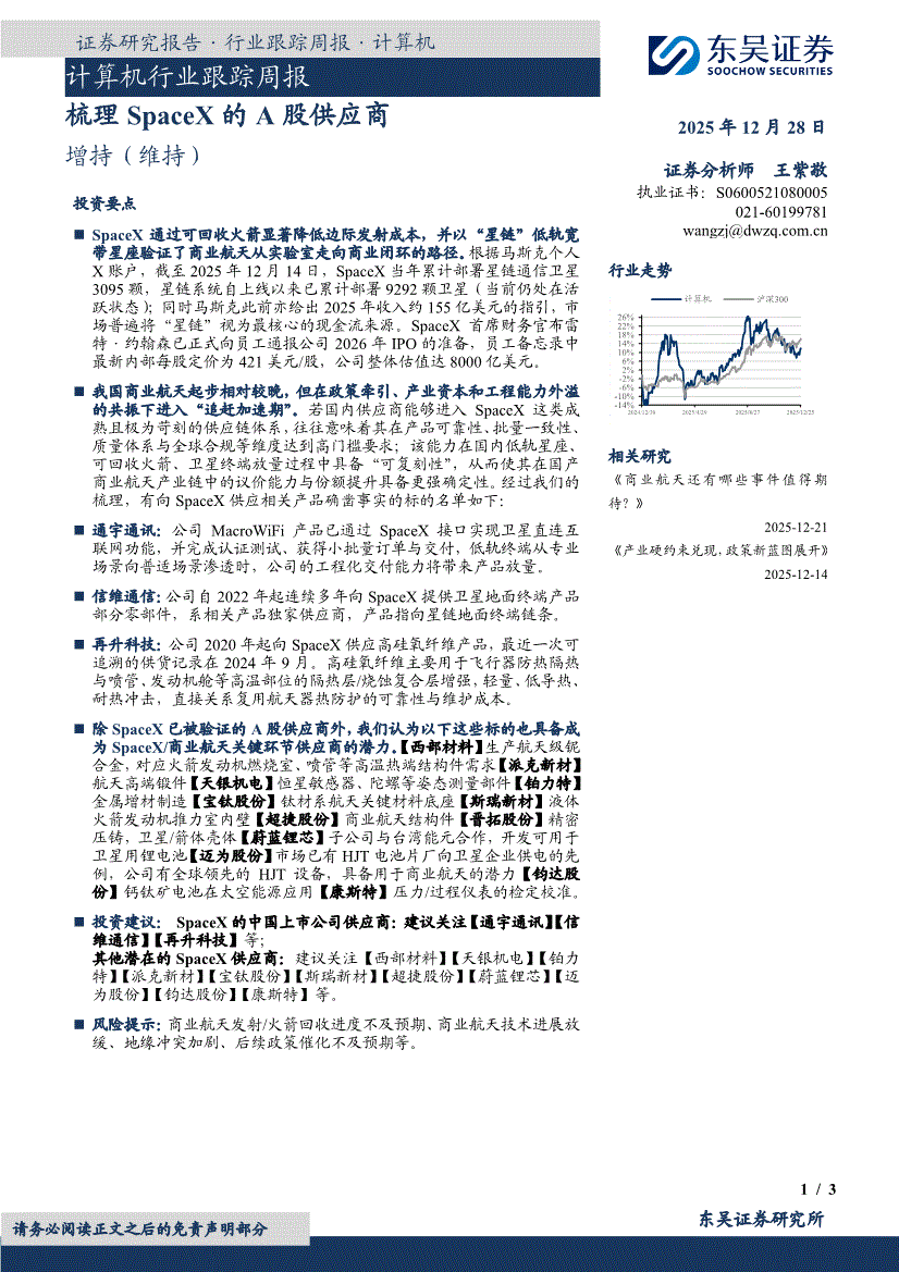 计算机行业:东吴证券-计算机行业跟踪周报:梳理SpaceX的A股供应商-251228