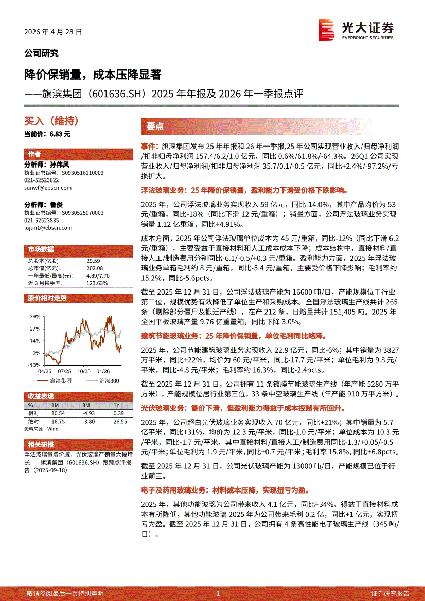 旗滨集团:光大证券-旗滨集团-601636-2025年年报及2026年一季报点评:降价保销量,成本压降显著-260428