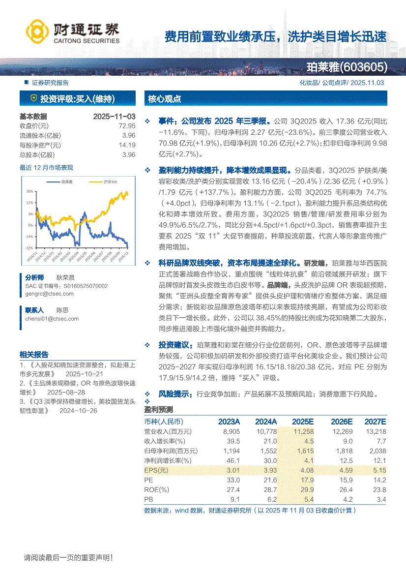 珀莱雅:财通证券-珀莱雅-603605-费用前置致业绩承压,洗护类目增长迅速-251103