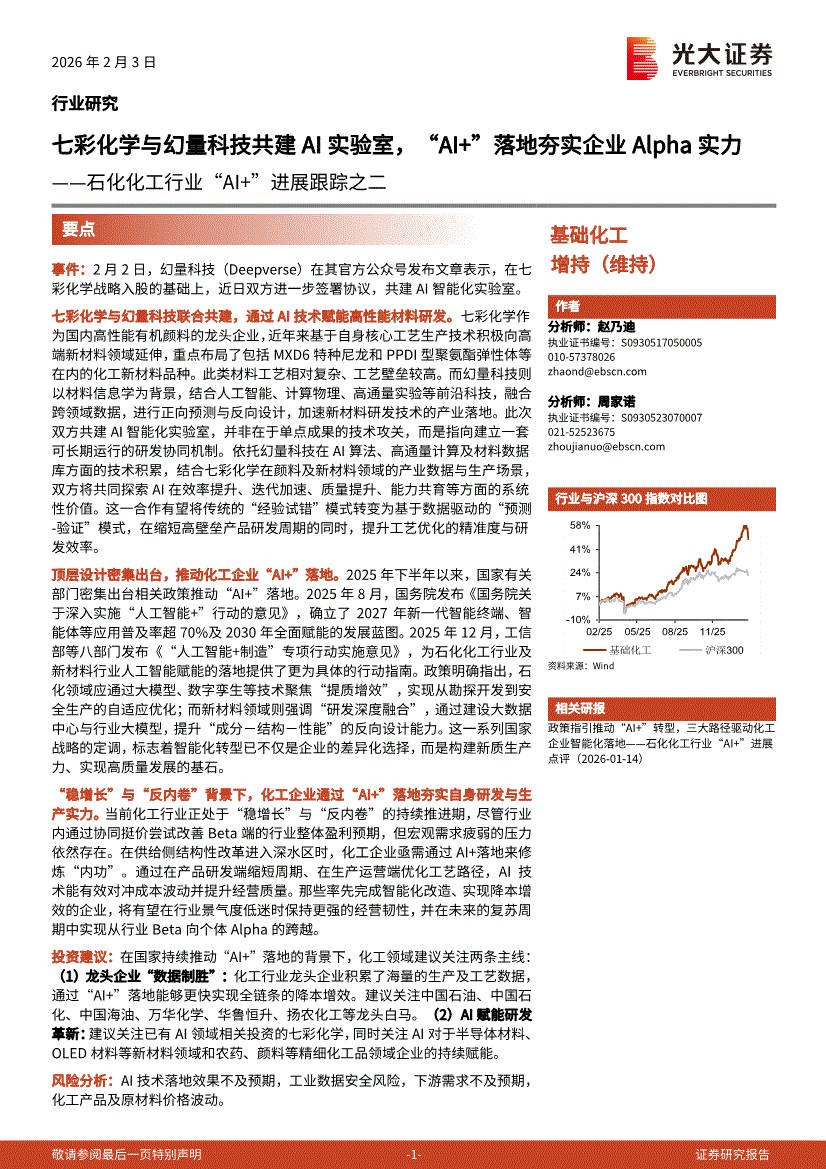 石化化工行业:光大证券-石化化工行业“AI+”进展跟踪之二:七彩化学与幻量科技共建AI实验室,“AI+”落地夯实企业Alpha实力-260203