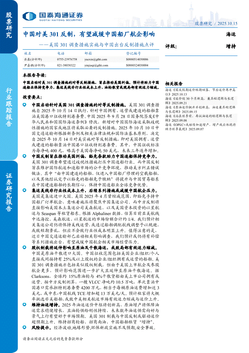 海运行业:国泰海通证券-海运行业美国301调查措施实施与中国出台反制措施点评:中国对美301反制,有望减缓中国船厂航企影响-251015