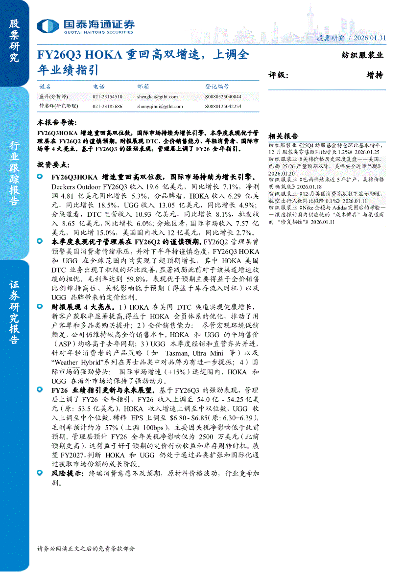 纺织服装行业:国泰海通证券-纺织服装行业:FY26Q3 HOKA重回高双增速,上调全年业绩指引-260131