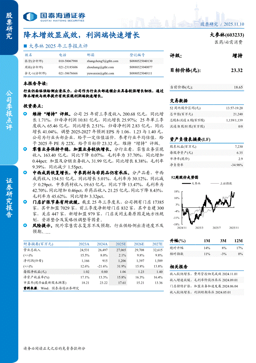 大参林:国泰海通证券-大参林-603233-2025年三季报点评:降本增效显成效,利润端快速增长-251110