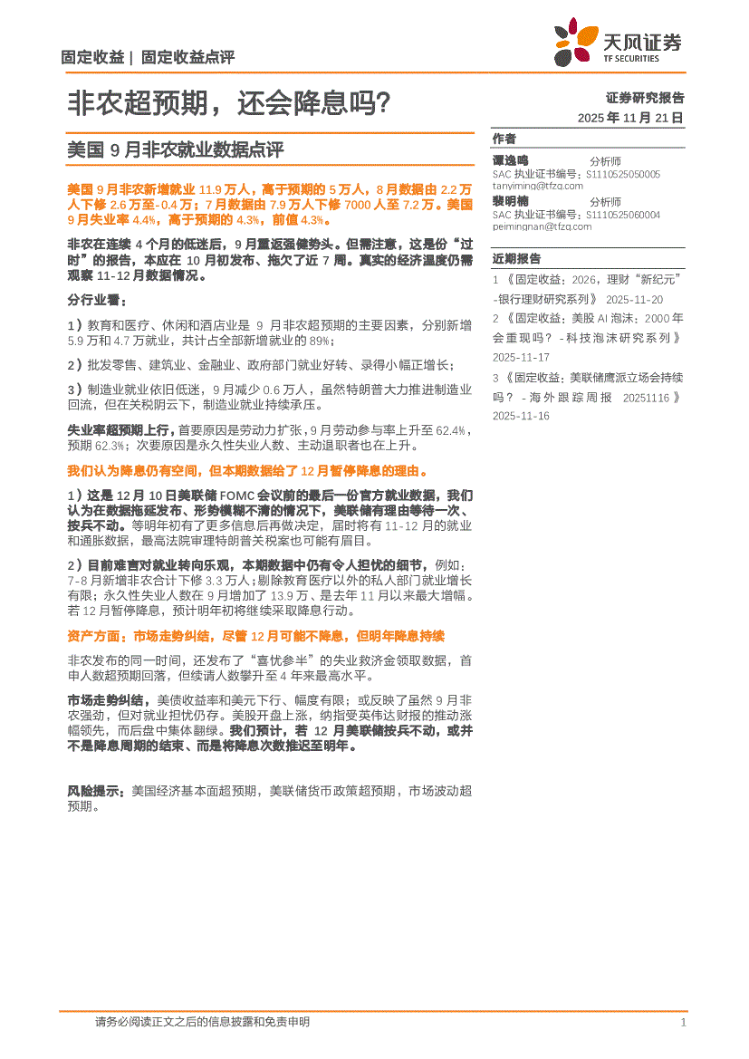 天风证券-美国9月非农就业数据点评:非农超预期,还会降息吗?-251121
