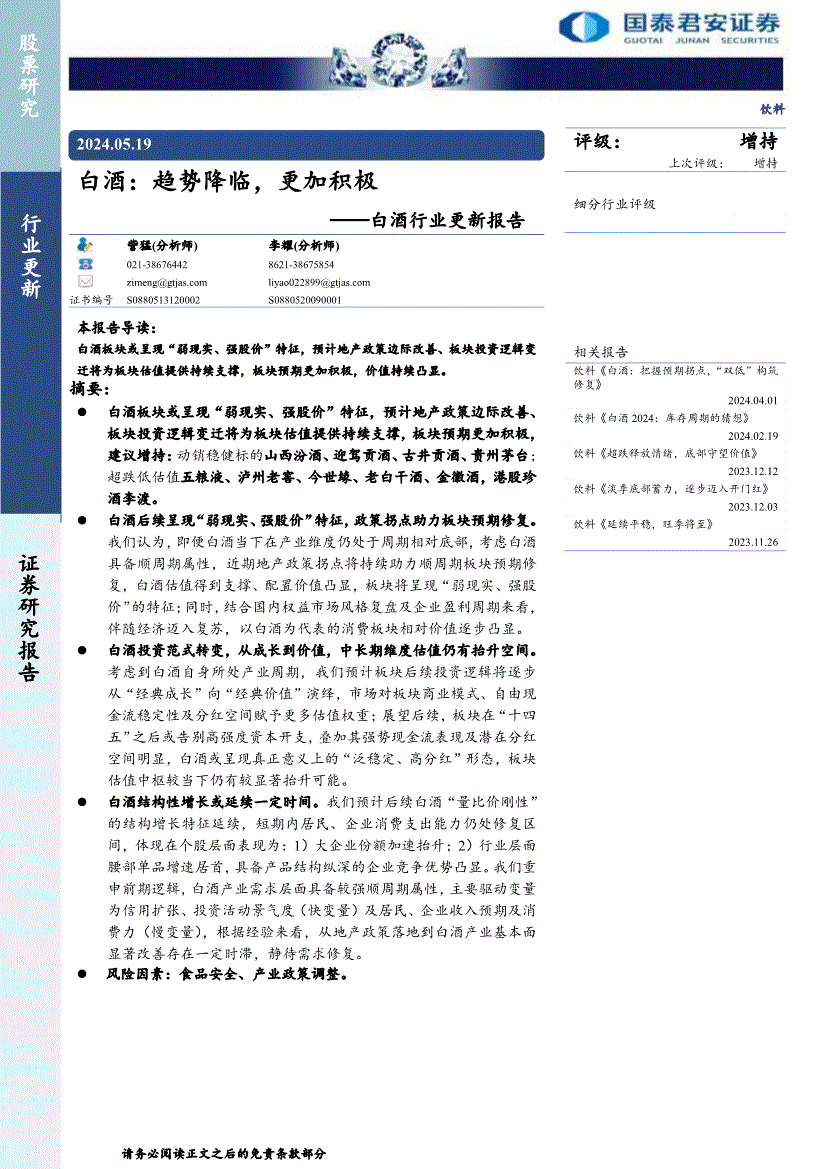 白酒行业:国泰君安-白酒行业更新报告:白酒,趋势降临,更加积极-240519