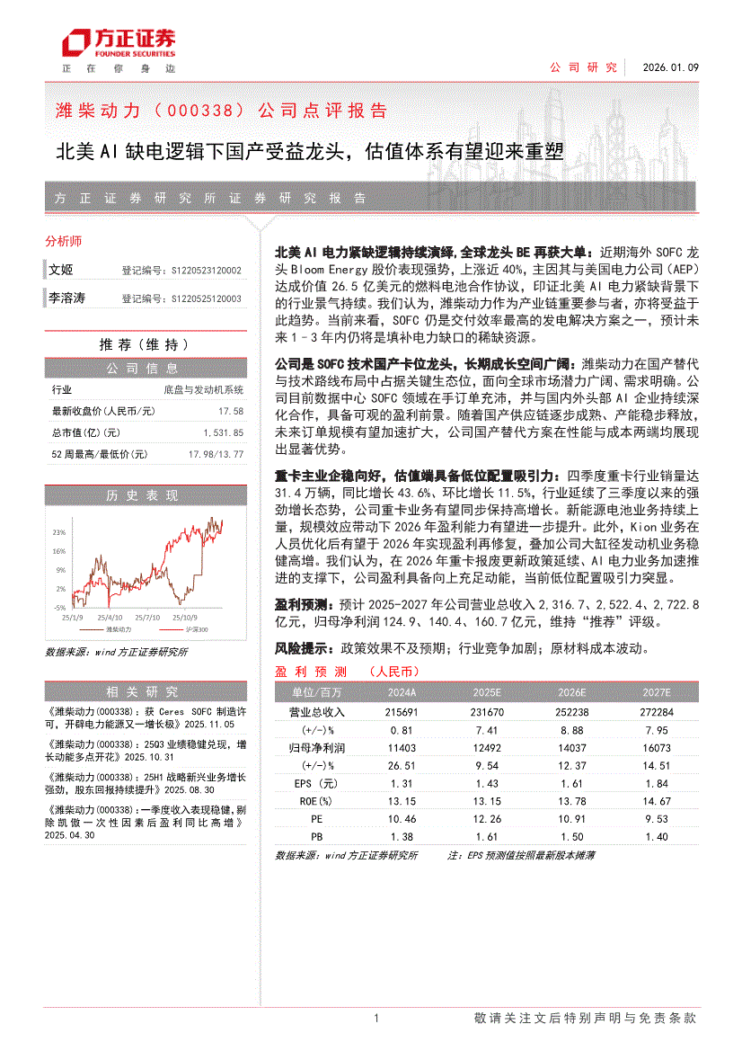 潍柴动力:方正证券-潍柴动力-000338-公司点评报告:北美AI缺电逻辑下国产受益龙头,估值体系有望迎来重塑-260109