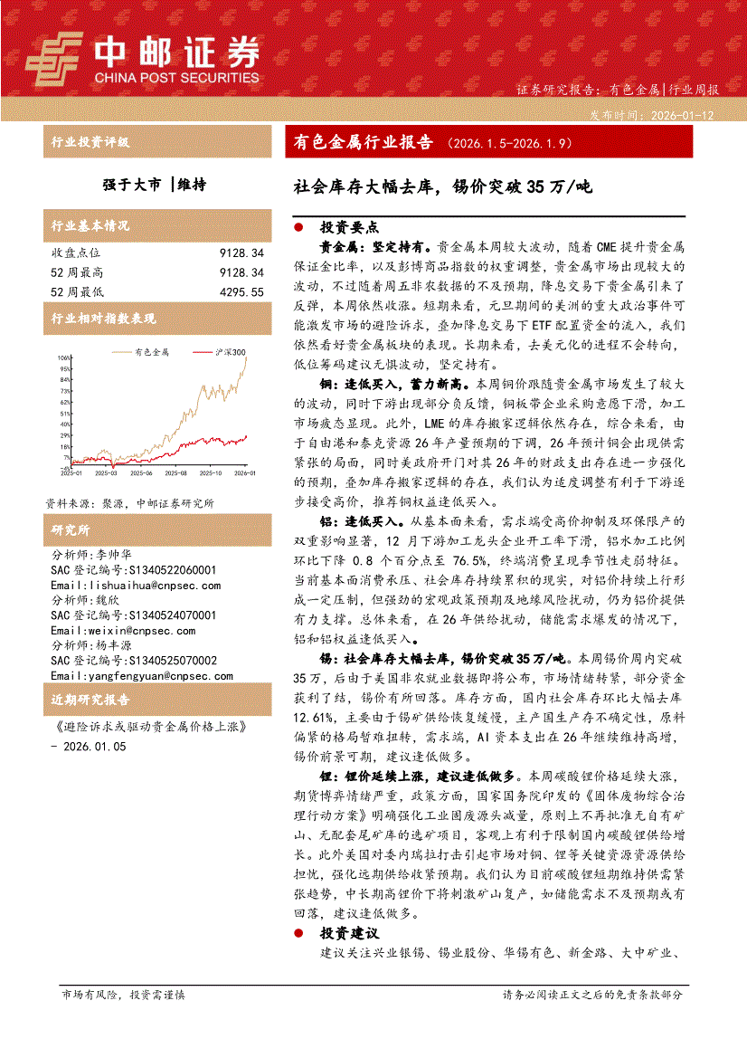 有色金属行业:中邮证券-有色金属行业周报:社会库存大幅去库,锡价突破35万/吨-260112