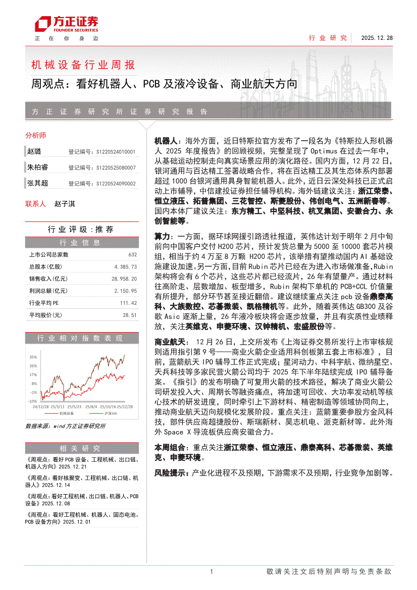 机械设备行业:方正证券-机械设备行业周报:周观点,看好机器人、PCB及液冷设备、商业航天方向-251228