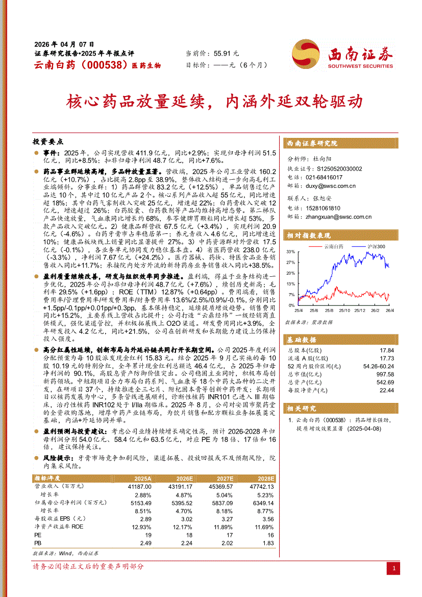 云南白药:西南证券-云南白药-000538-核心药品放量延续,内涵外延双轮驱动-260407