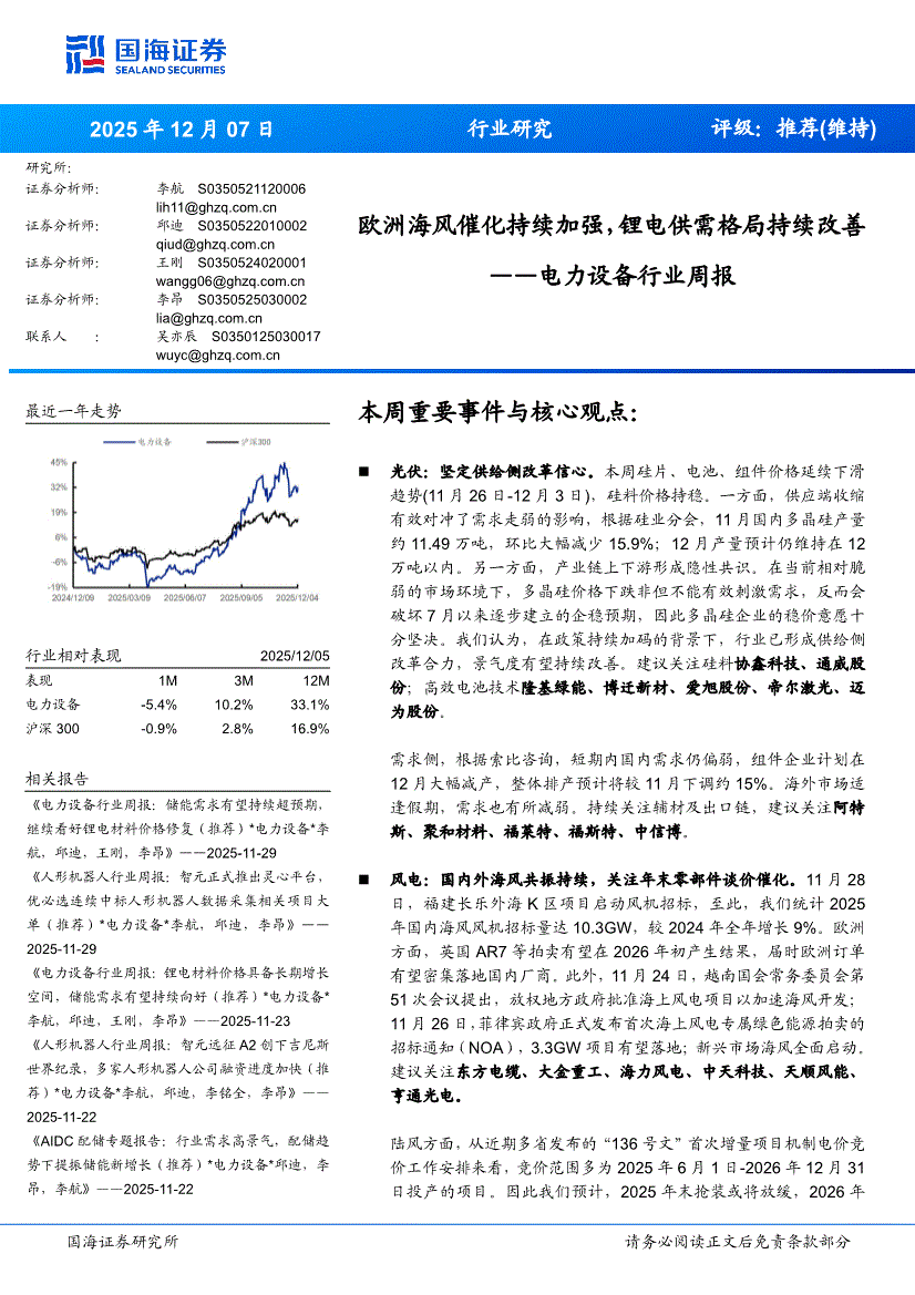 电力设备行业:国海证券-电力设备行业周报:欧洲海风催化持续加强,锂电供需格局持续改善-251207