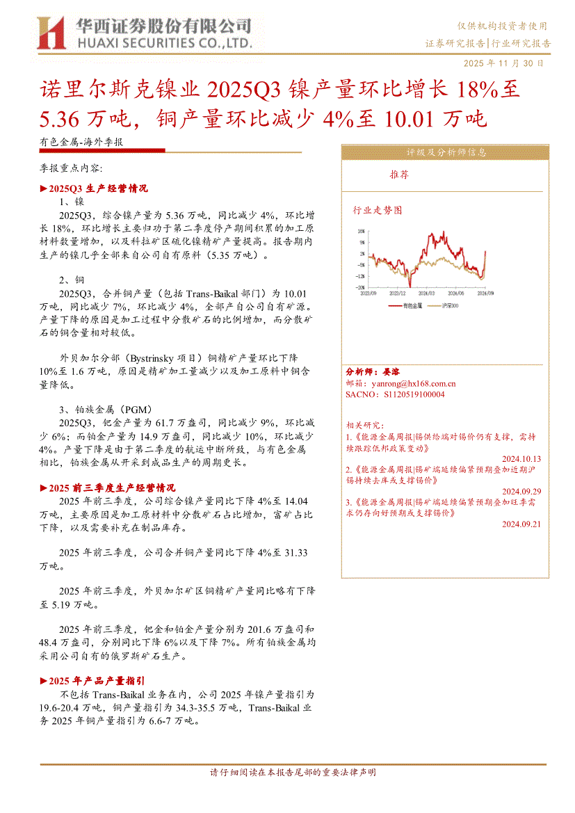 有色金属行业:华西证券-有色金属行业~海外季报:诺里尔斯克镍业2025Q3镍产量环比增长18%至5.36万吨,铜产量环比减少4%至10.01万吨-251130