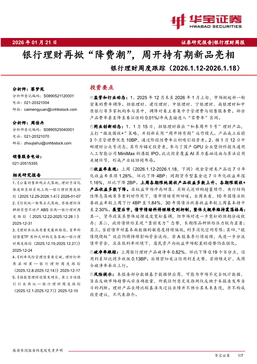 银行业:华宝证券-银行业理财周度跟踪(2026.1.12~2026.1.18):银行理财再掀“降费潮”,周开持有期新品亮相-260121