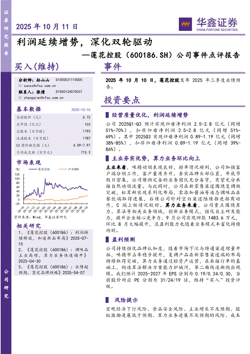 莲花控股:华鑫证券-莲花控股-600186-公司事件点评报告:利润延续增势,深化双轮驱动-251011