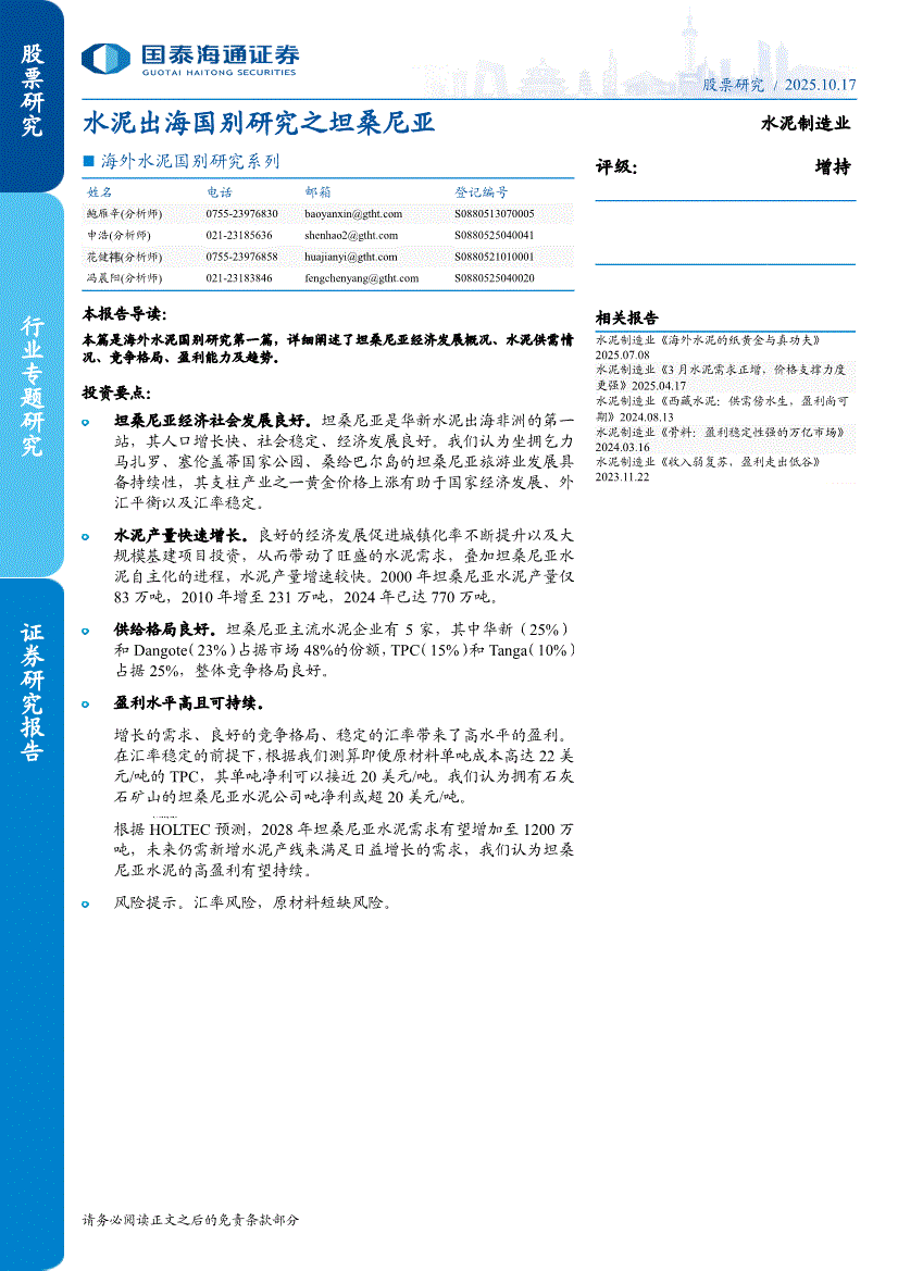 水泥制造行业:国泰海通证券-水泥制造行业海外水泥国别研究系列:水泥出海国别研究之坦桑尼亚-251017