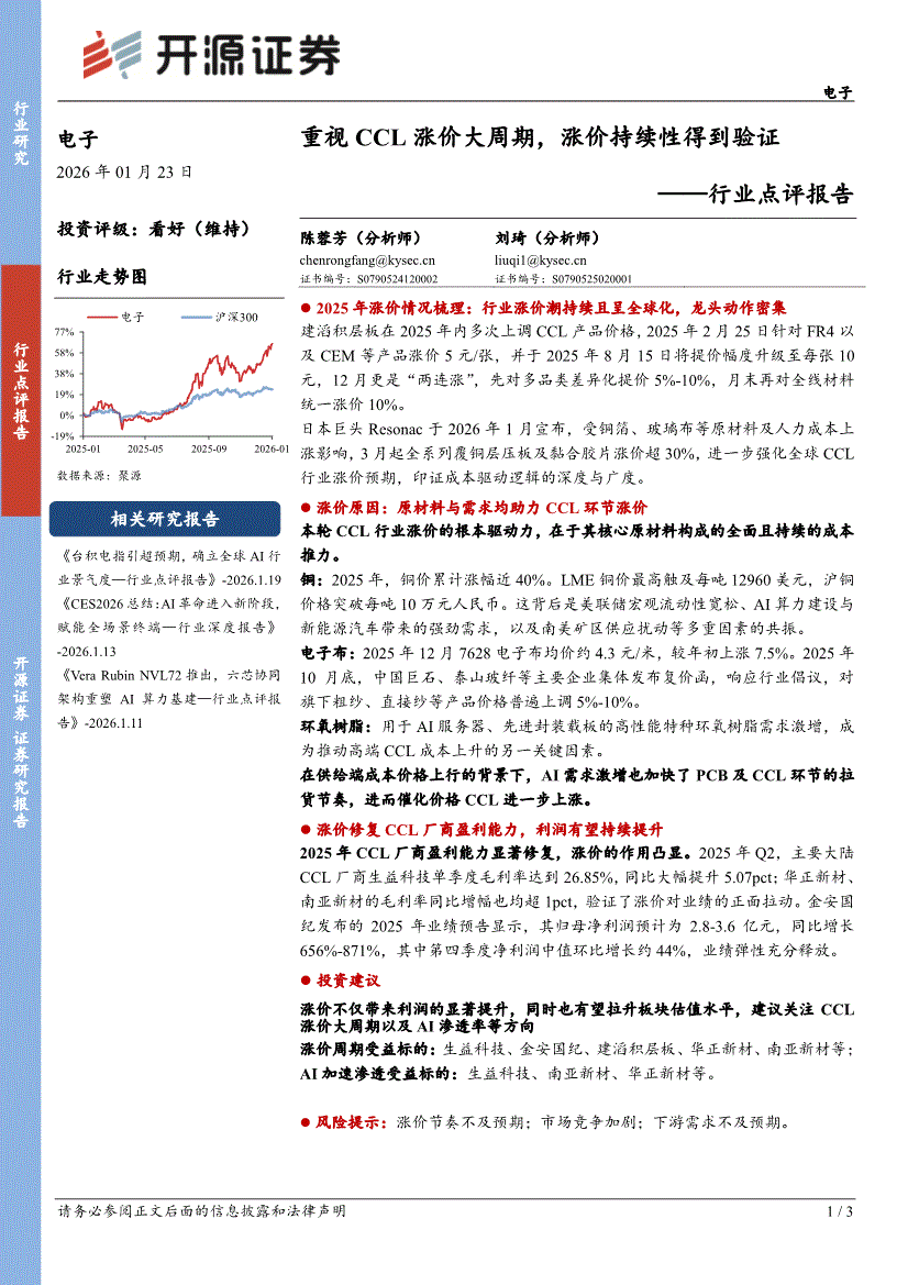 电子行业:开源证券-电子行业点评报告:重视CCL涨价大周期,涨价持续性得到验证-260123