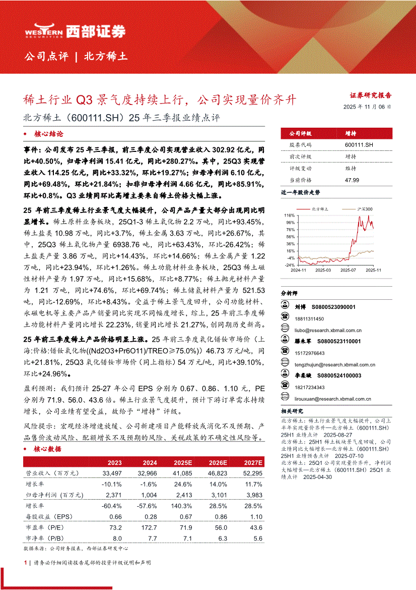 北方稀土:西部证券-北方稀土-600111-25年三季报业绩点评:稀土行业Q3景气度持续上行,公司实现量价齐升-251106